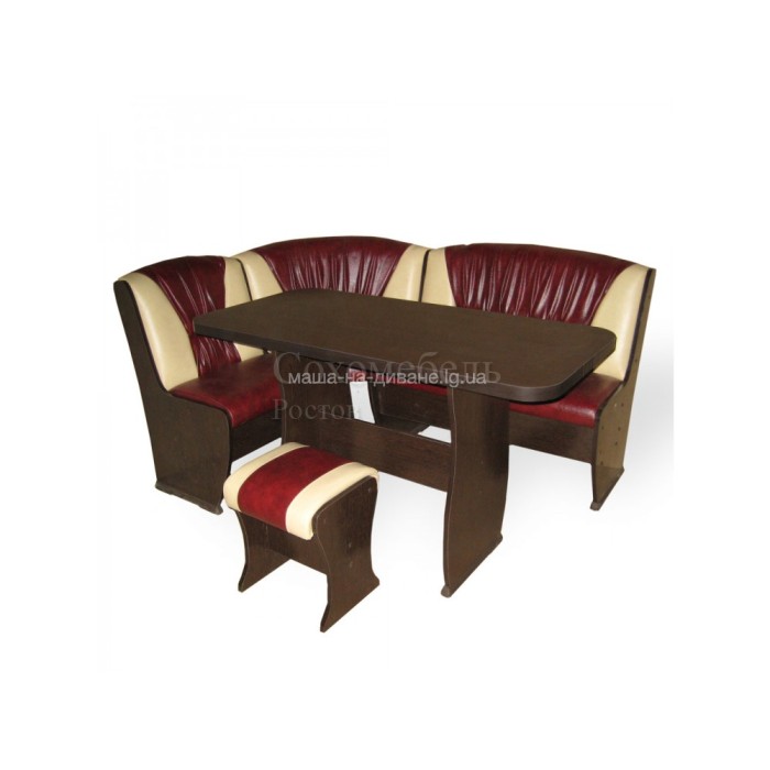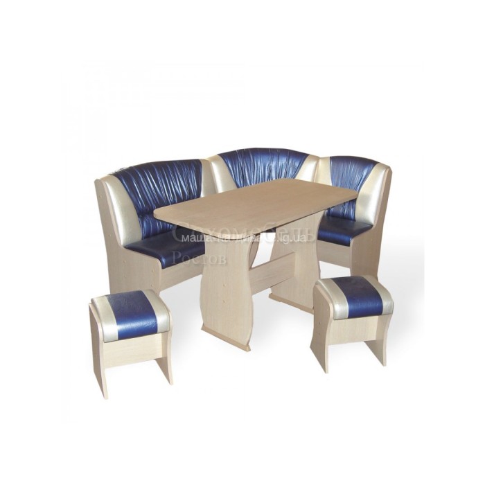 В комплект входит мягкий угловой диван, стол и два табурета. Скамья кухонного уголка оснащена ящиком под сидением, может быть собрана как в левостороннем так и в правостороннем варианте.