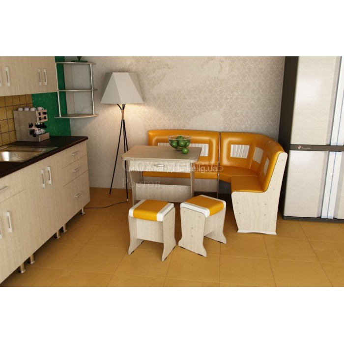 Аккуратный и уютный кухонный уголок изготовлен из качественного ЛДСП, обивка кожзаменителя прочна и легка в уходе.